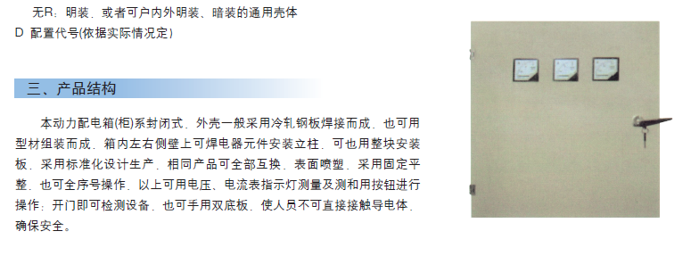 本產品采用了國際IEC標準和國家標準設計制造的新型動力配電箱,此產品選用國外電器元件,或國內生產比較先進的電器元件。